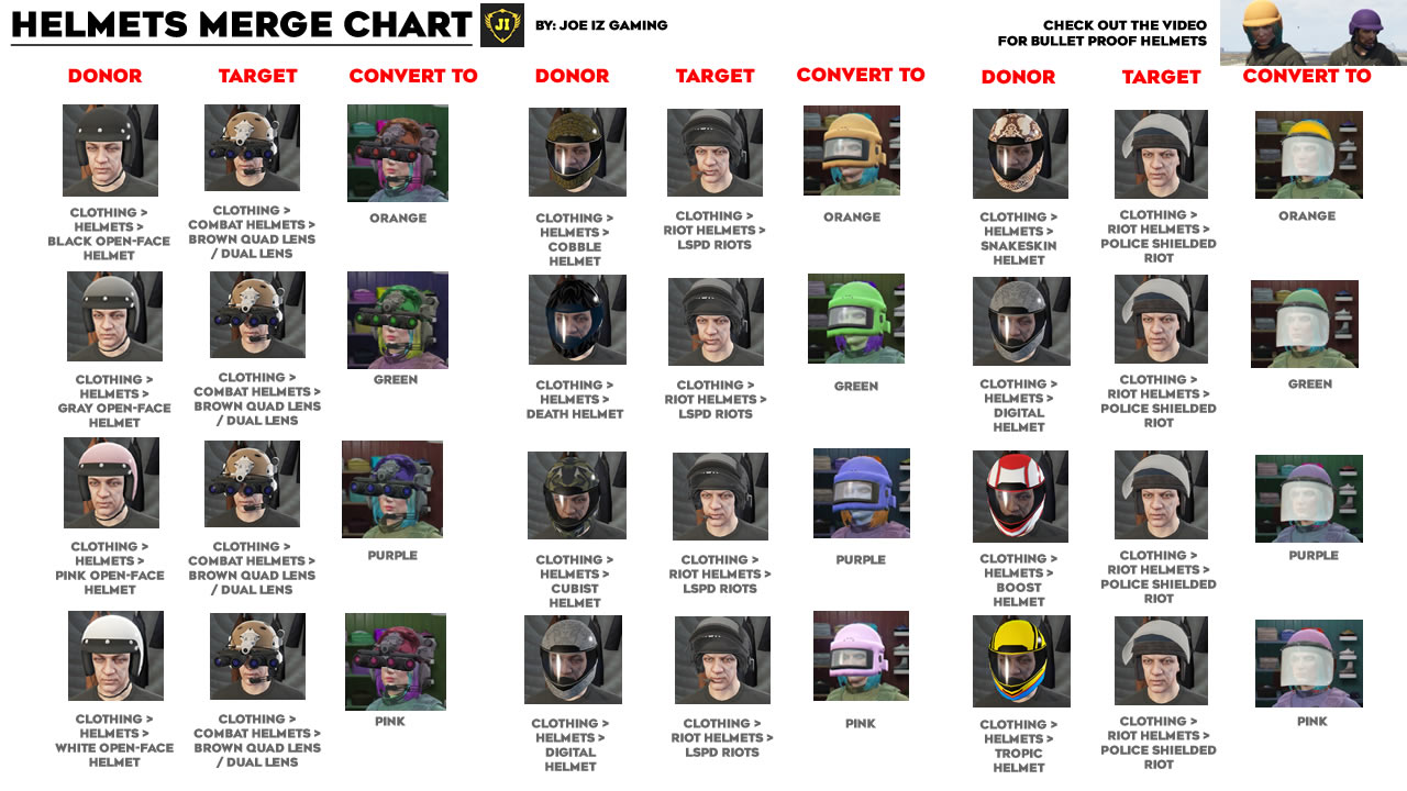 Helmets merge chart by Joe Iz Gaming: donor and target helmet combinations for open-face, LSPD Riots, and Police Shielded Riot helmets